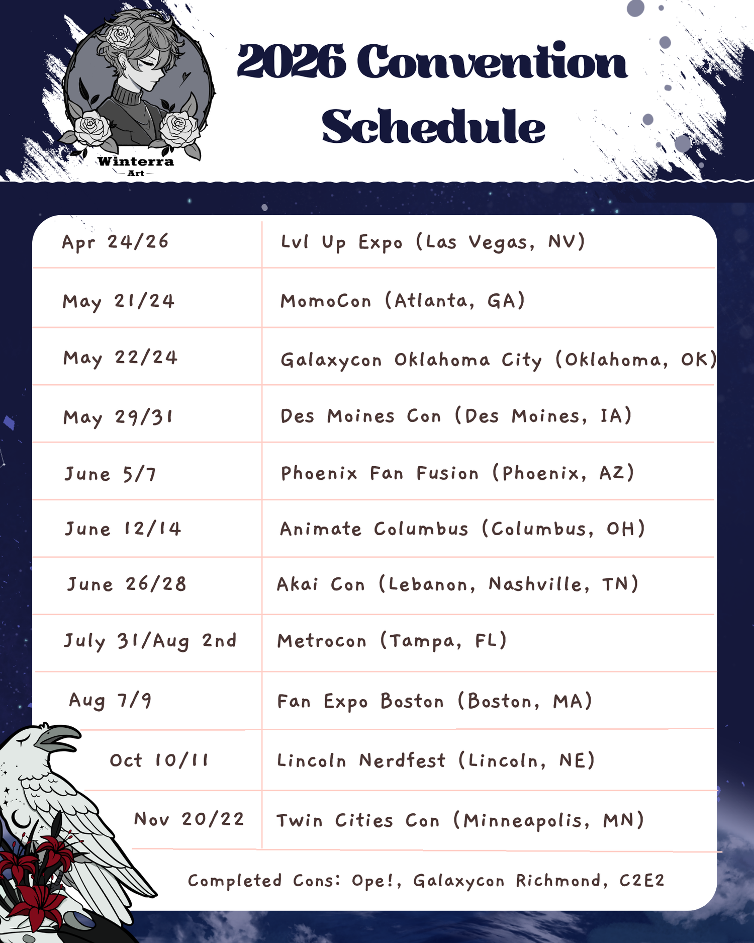 The current 2025 convention schedule! This is always subject to change.